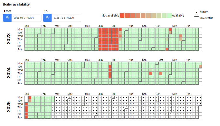 - Visualizes data intensity over a time-based calendar grid