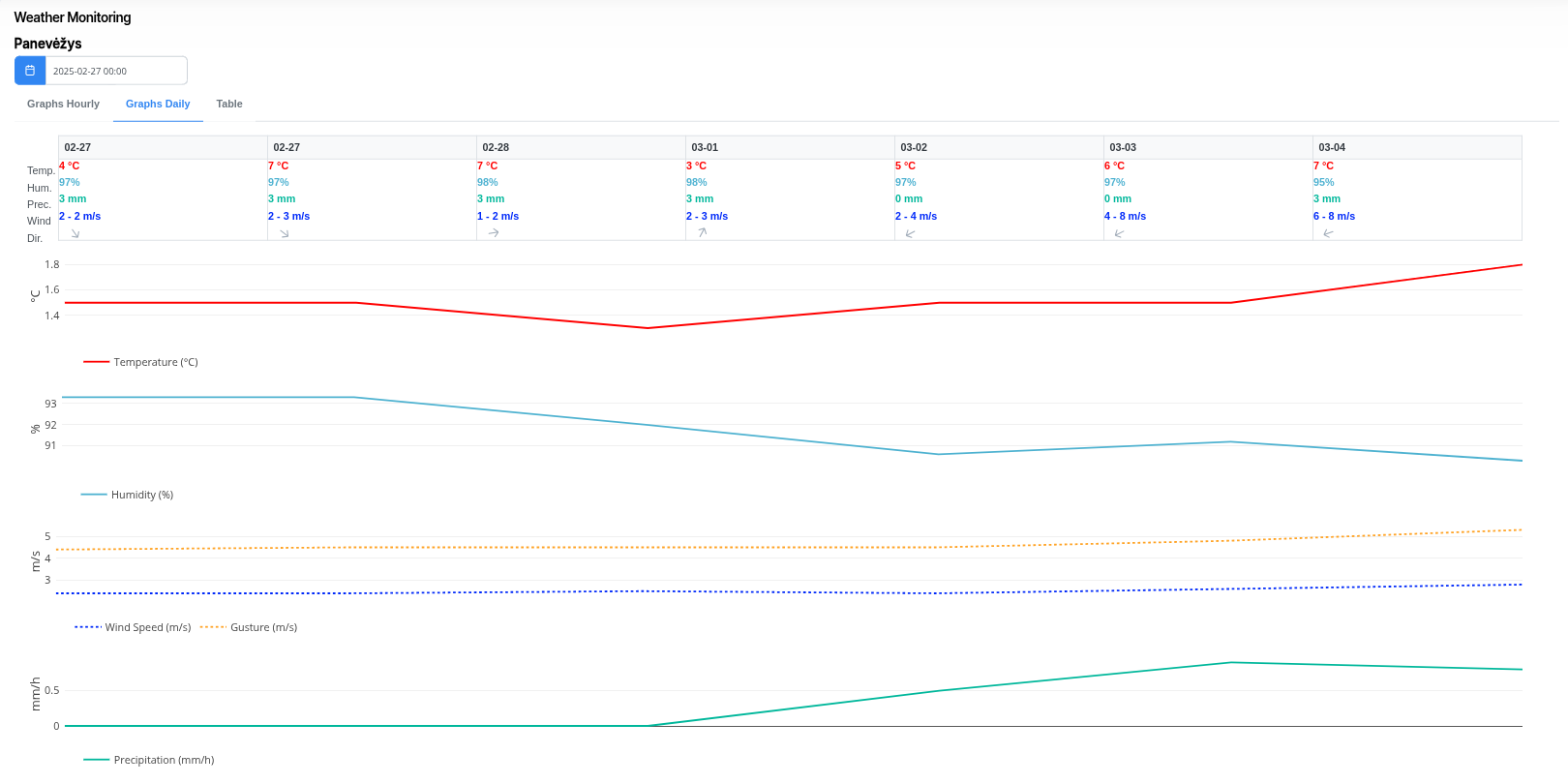 - Hourly and Daily Graphs: Interactive charts display temperature, humidity, wind speed, and precipitation trends over time.