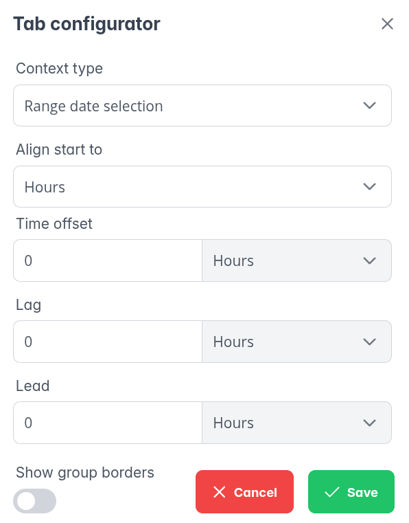 Range Date Selection: Provides options to align the start, set offsets, and define a date range using from/to inputs.
